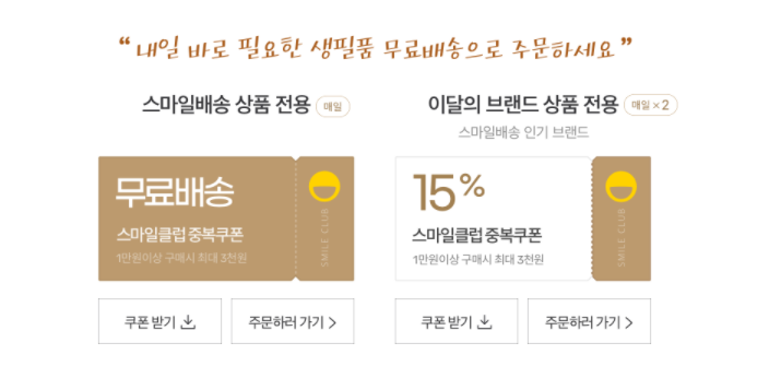 이외에도 스마일 클럽에게만 특별히 지급되는 등급 쿠폰, 당일배송 할인 쿠폰이 주어지는데